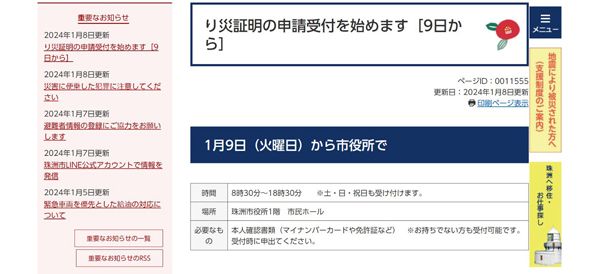 実は珠洲市での案内当初、本人確認書類に関して、「※お持ちでない方も受付可能です。受付時に申出てください」という記載がホームページにありませんでした。そのため、現地で支援活動をする民間支援団体などから、本人確認書類が手元にない被災者(避難者)はどうしたらよいのか、という声が上がっていたのです。幸い、早い段階でこの課題を認識することができたので、すぐに石川県や関連自治体へ、罹災証明書の申請時には、本人確認書類の持参は必須ではないという説明をさせていただくことができました。石川県や民間支援団体の方々の協力もあり、その後速やかにホームページの案内改善が実現しました。
