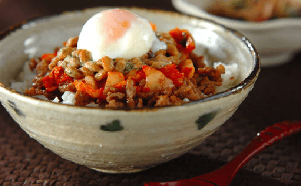 納豆+キムチの発酵食品コンビで、健康や美容にも良い効果が期待できる、スタミナ満点の丼料理。上にのせた温泉卵をホロホロに崩し、全体にからめるように混ぜてから食べると、キムチの辛さが和らぎます。