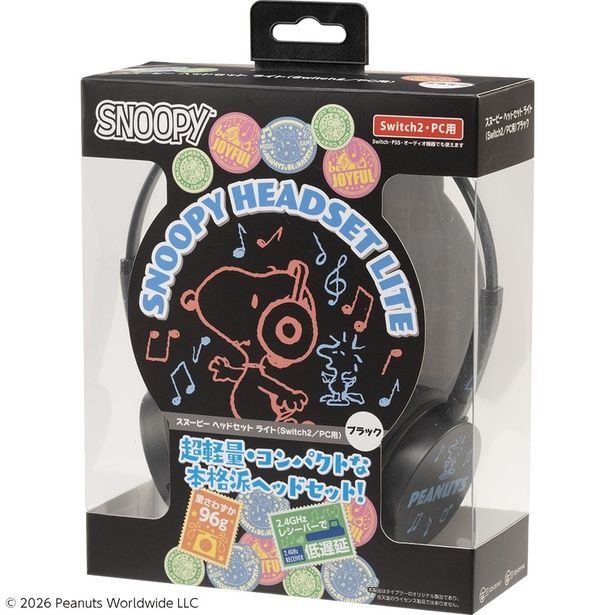 株式会社タイプツーから登場したのは、「スヌーピー ヘッドセット ライト(Switch2/PC用)」(5478円)。コミック「PEANUTS」でおなじみのスヌーピーとウッドストックをあしらった、超軽量&コンパクトな本格派ワイヤレスヘッドセットだ。カラーはホワイトとブラックの全2色で展開される。