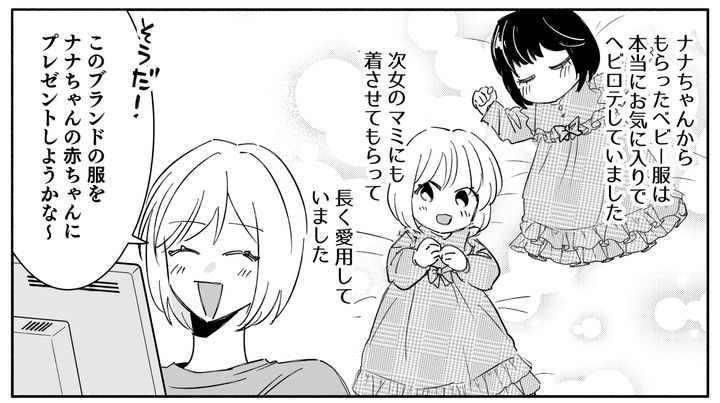 「昔、ナナがユカちゃんの出産祝いにあげたベビー服を貸してほしいのよ」
