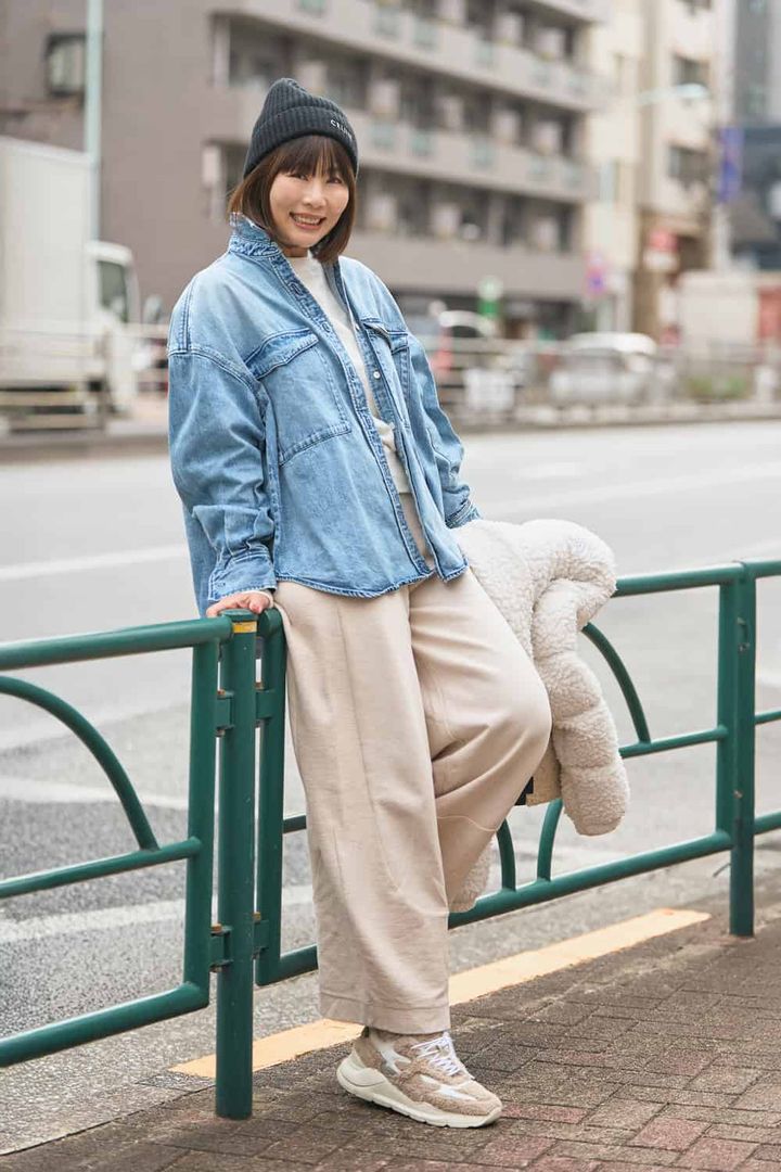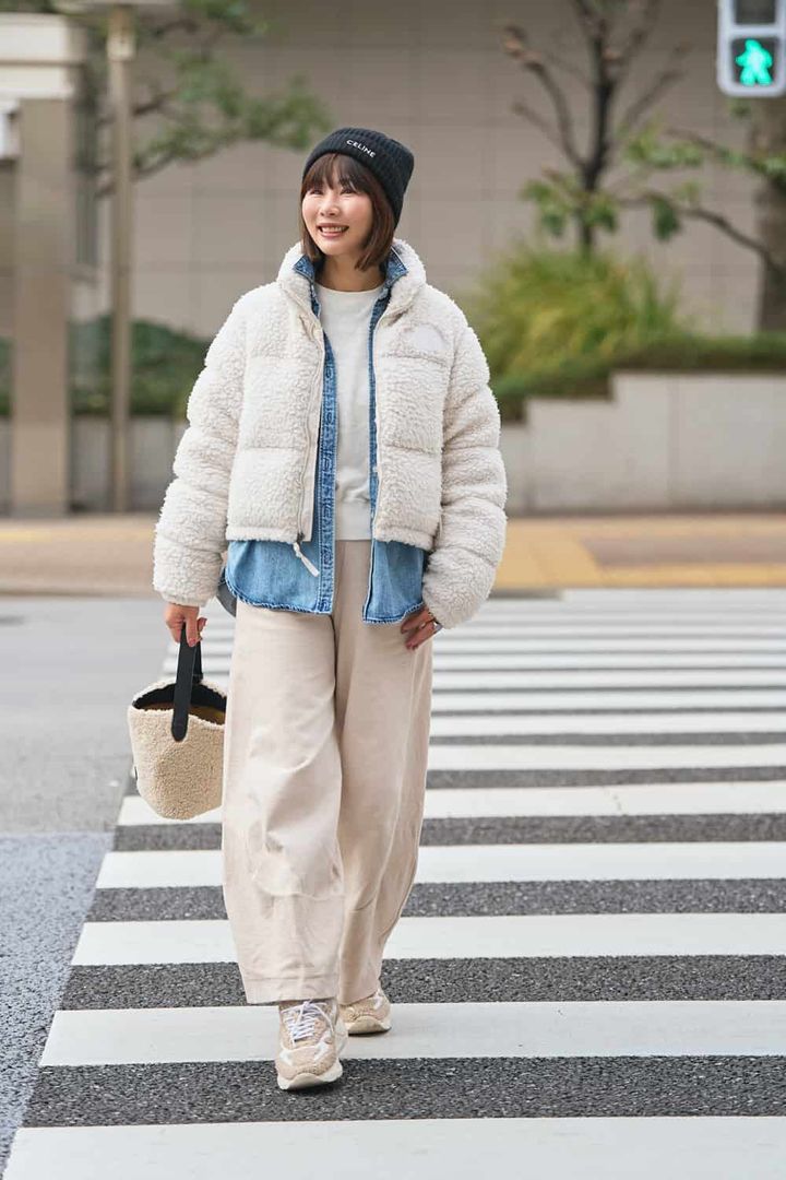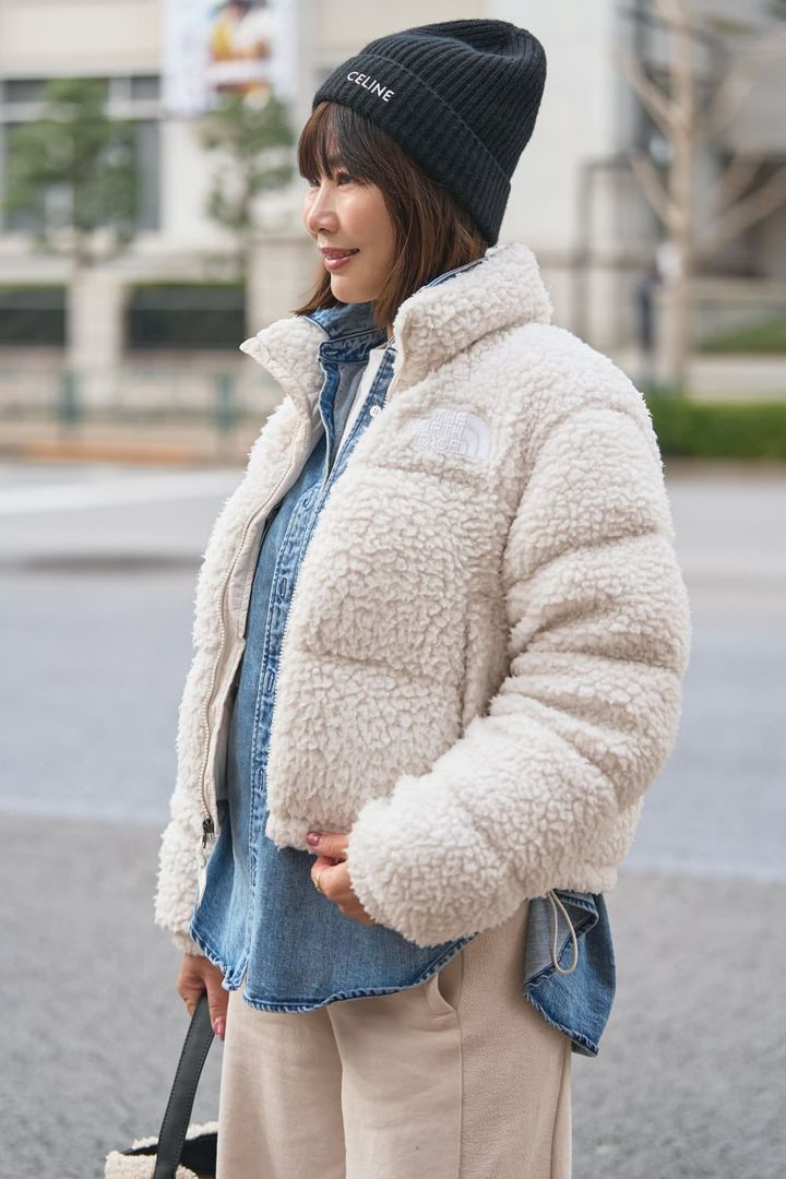 「韓国限定ホワイトレーベルのノースフェイスは、海外ECサイトでようやく出合えたお気に入りアイテム。デニムやスエットのほか、柄ものやカラーパンツまで幅広く合わせられるショート丈の白を狙っていました。冬のアウトドアはスエットパンツでカジュアルにしつつ、ダウンを脱いだ時のラフすぎる問題を解消するため、デニムシャツをレイヤードしてバランスを取りました」