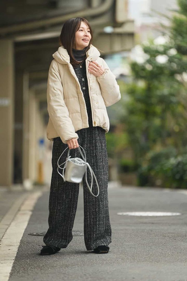 「珍しいコーデュロイ素材のダウンはカジュアルからキレイめまでシーンを問わず使え、あたたかさを感じる素材感に惹かれました。白は汚れが気になるものの、挑戦しやすい価格帯だったのも決め手の1つ。着回しが利くダウンの下は、ビジネスシーンに着て行きたいツイードのオールインワンで品とこなれ感をプラスしました。オンオフ問わず、活躍する1着です」