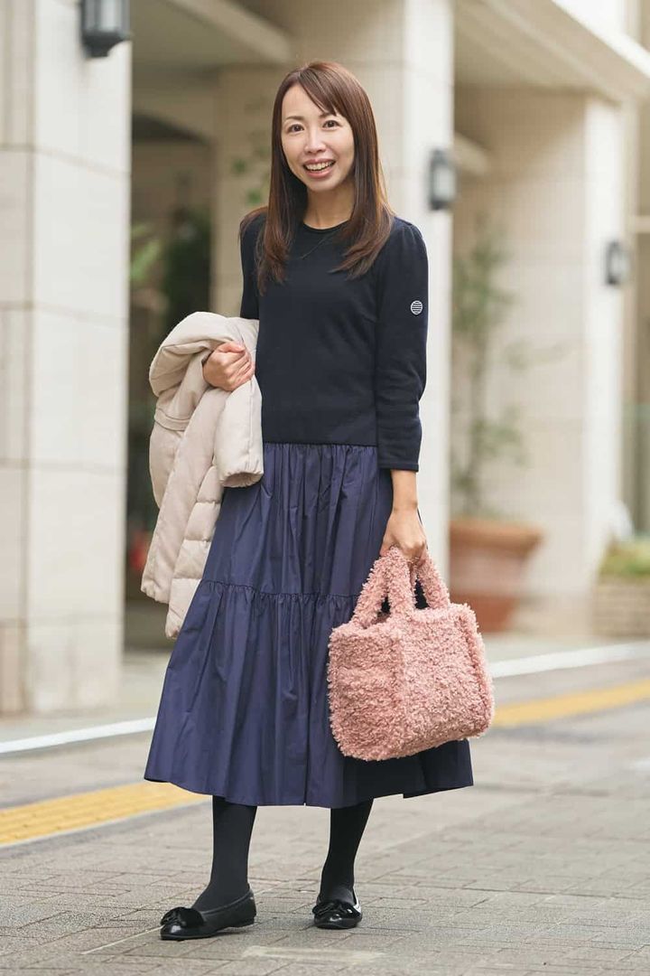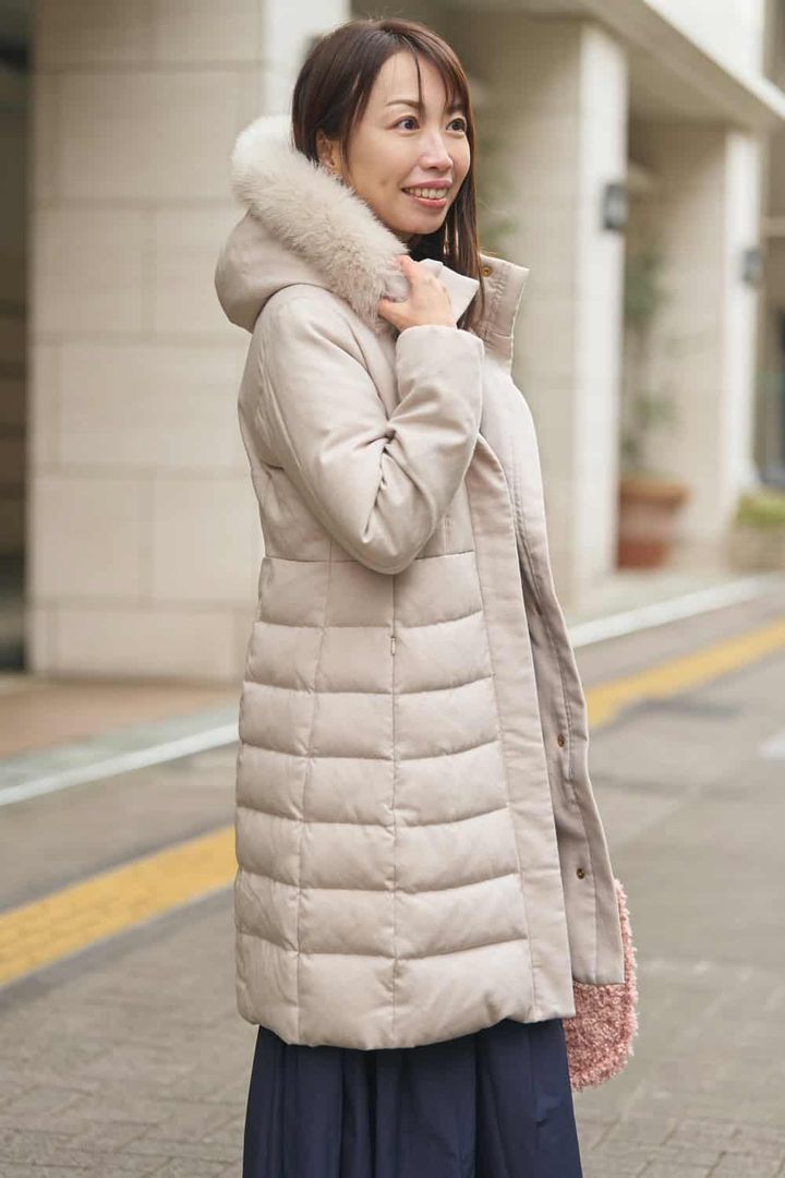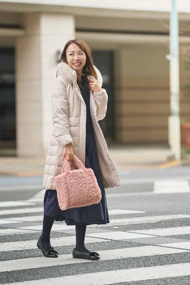 「ダウンはカジュアルな印象になりがちですが、アナイはどんなスタイルと合わせてもきれいめに見せてくれます。冬はシックな色を着ることが多くなるため顔映りの良いピンクベージュを選びました。大好きなネイビーのワンピースとの色の相性と丈感が絶妙で、アイテムを選ばず着回せます。全体的に落ち着いたコーデには、モコモコバッグで遊び心をプラス。ロング丈なので、テーマパークなど長時間のおでかけにも頼れるアイテムです」