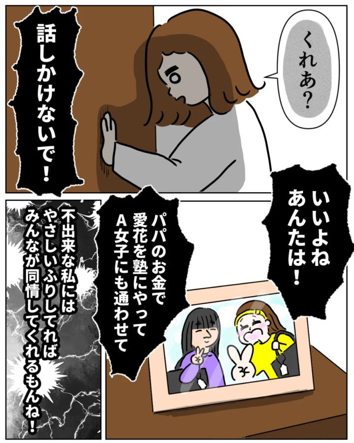 その後、くれあの部屋の前で話しかけ、今は誰もいないし少し話さない」と声をかけると、「話しかけないで!」とくれあの声が。「いいよねあんたは!パパのお金で愛花を塾にやって、A女子にも通わせて。不出来な私にはやさしいふりしてれば、みんなが同情してくれるもんね!」と酷い言葉を浴びせられました。