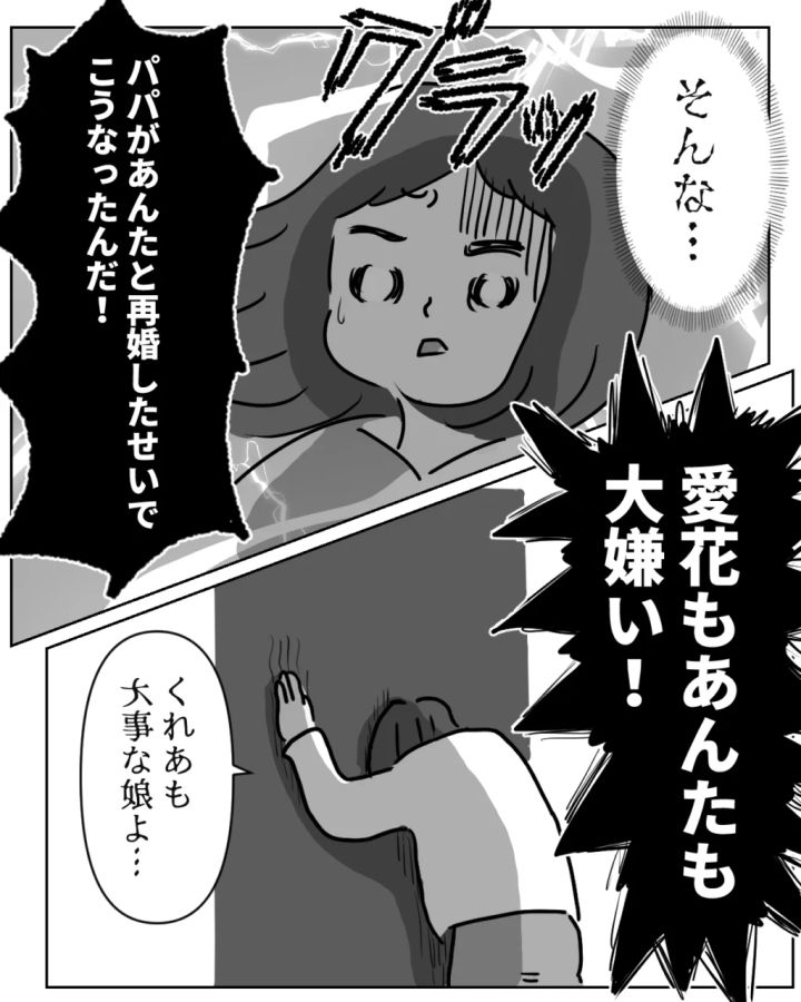 くれあの言葉に「そんな・・」と絶望的な気持ちになる私。くれあはさらに「パパがあんたと再婚したせいでこうなったんだ!あんたも愛花も大嫌い!」と言い、体中で私を拒否しているのを感じ、「くれあも大事な娘よ・・」と伝える声にも力が入りませんでした。