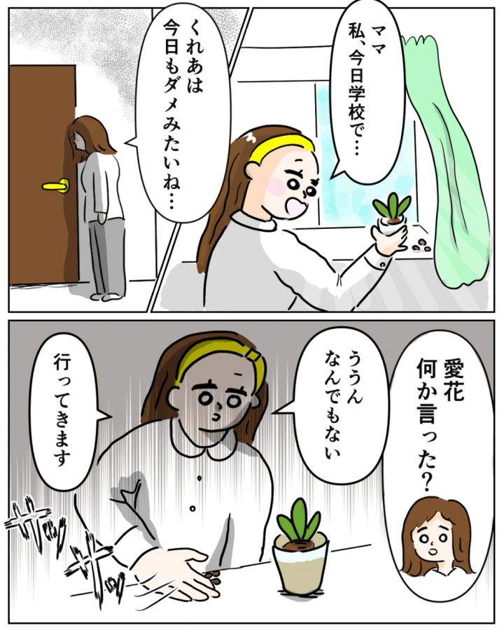 そんな時、「ママ、私今日学校で・・」愛花が私に話しかけていたのも気づかず、「くれあは今日もダメみたいね・・」とがっかりする私。ふと、「愛花何か言った?」そう思って愛花に話しかけると、「ううん。なんでもない。行ってきます」そう言って、風で倒れてしまった観葉植物を直して学校に行ってしまいました。
