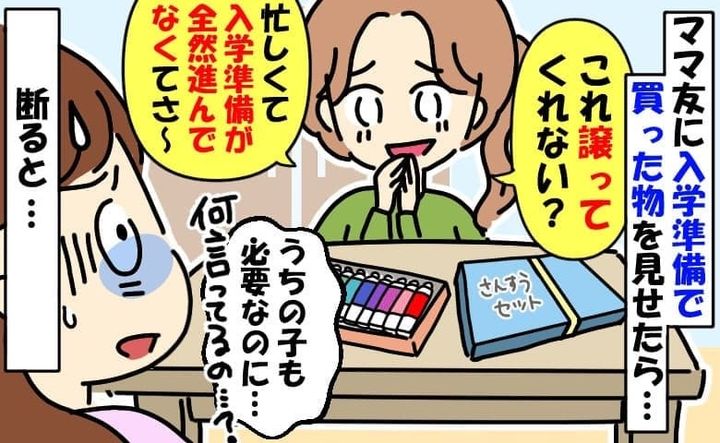 ママ友「譲って♡準備進んでなくて」入学準備で購入した物を要求。え…?断ると困り顔から笑顔に!実は
