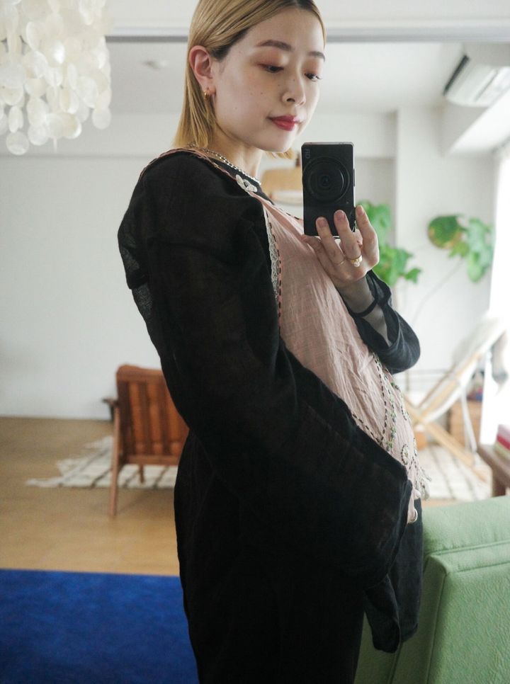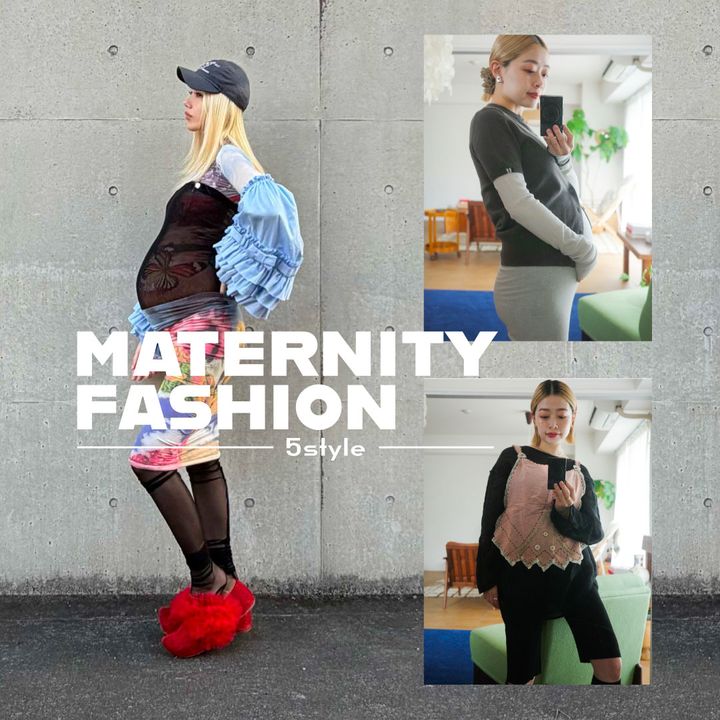 Q.マタニティ期のファッションのこだわりを教えてください。「自宅のクローゼットを見直して、マタニティ期でも着られるものを見つけて楽しんでいました。数年ぶりに手に取るアイテムもあり、流行りにとらわれず今できるファッションを楽しむマインドを大切にしていました」