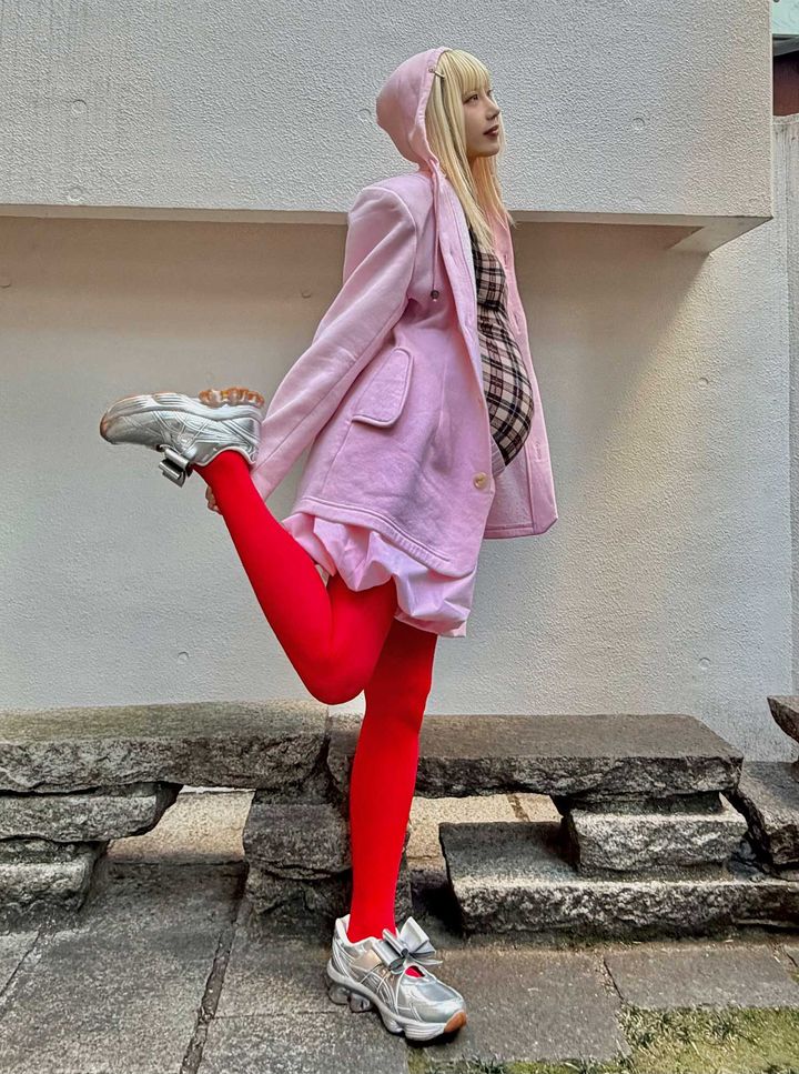 妊娠10ヵ月 「水着素材のワンピは暖かく伸縮性に優れているので、マタニティ期に使いやすいことが判明! 肌寒くなってからとても活用していました。『シュシュトング×アシックス』のスニーカーはペタンコすぎず、全体のバランスも取ってくれて歩きやすいです」マタニティ期に気分の上がる、ピンク×赤の組み合わせがキュート!アウター/メートル・ピエール、トップス/海外サイトで購入した水着素材のワンピース、スカート/古着、スニーカー/シュシュトング×アシックス