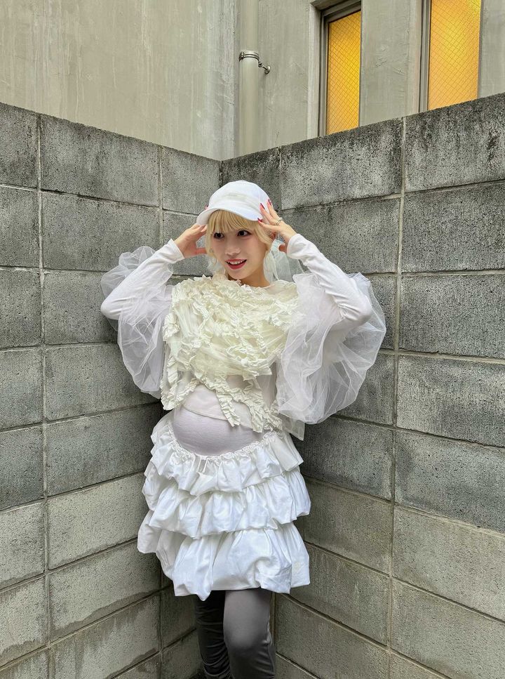 妊娠8ヵ月「ホワイトを重ねてコーディネートしました。それぞれ違う素材のアイテムでまとめたところがポイントです」チュールやフリルを合わせたドレッシーなスタイリング。インナーはやさしい素材の『プチバトー』を。トップス/チカキサダ、インナー/プチバトー 、スカート/ノワール ケイ ニノミヤ、キャップ/キムへキム