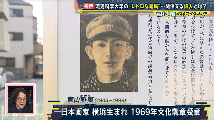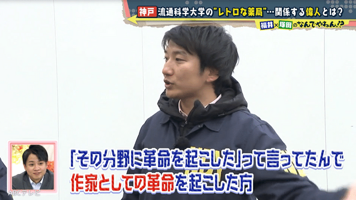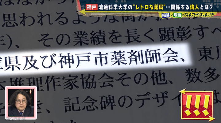 地碑に「神戸市薬剤師会」という記載があることから、塚田と福井アナは、サカヱ薬局が実家の偉人=文学界に革命を起こした横溝正史と仮定。「神戸の子どもたちに学問をしっかりと学んでほしいという思いを持って、あの地に学校を建てた。それが今の流通科学大学になっている」と最終的に予想をまとめた。