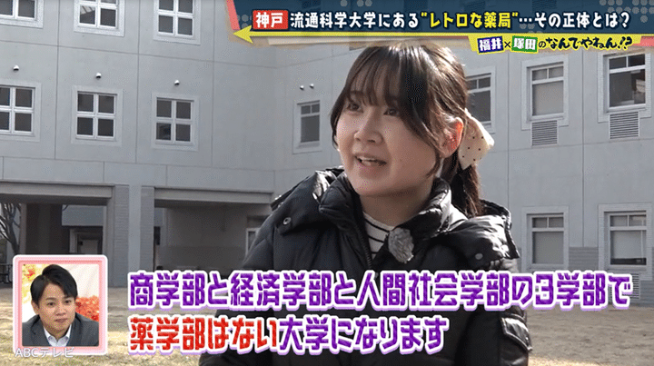 流通科学大学に薬学部はなく、サカヱ薬局は薬局として現在も使われているような見た目ではない。そのため塚田と福井アナは、サカヱ薬局=「流通の原点になった薬局の資料館」と予想した。