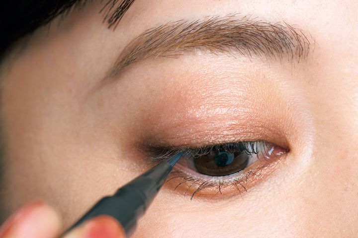 まつ毛の間を埋めるようにインラインを入れフレームを強調。目尻にラインを伸ばすのはNG。