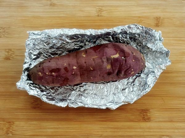 レンジでチンすると甘味が失われてしまうとのことで、次の日はアルミホイルで巻いてオーブントースターの「あたため」でじっくり温めてみました。