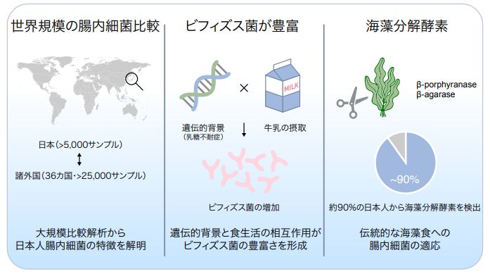 日本人の腸内細菌は、高所得国型の構成を持ちながらも、ビフィズス菌の豊富さや海藻分解酵素の高頻度といった独自の特徴を備えていました。