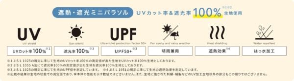 *JIS L 1925の規定に準じて生地のUVカット率100%の測定値が出た生地をUVカット率100%生地としています。JIS L 1055 A法にて遮光率100%の測定値が出た生地を遮光率100%生地としています。JIS L 1925の規定に準じて生地のUPF値を測定しています。 ※記載の結果は生地の状態での測定値であり、傘本体の性能を示す数値ではありません。また、生地に施された刺繍・縫製などのUV加工生地以外の部分もこの限りではありません。