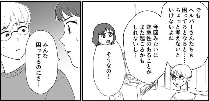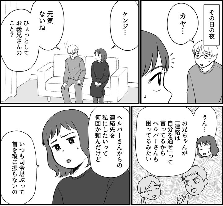 すぐ駆けつけられる距離に私がいるのに、兄が司令塔ぶって「まずは自分に連絡を」と言っているため、ヘルパーさんも困っているのです。私が愚痴るように言うと、ケンジは「うんうん」とうなずきながら聞いてくれました。