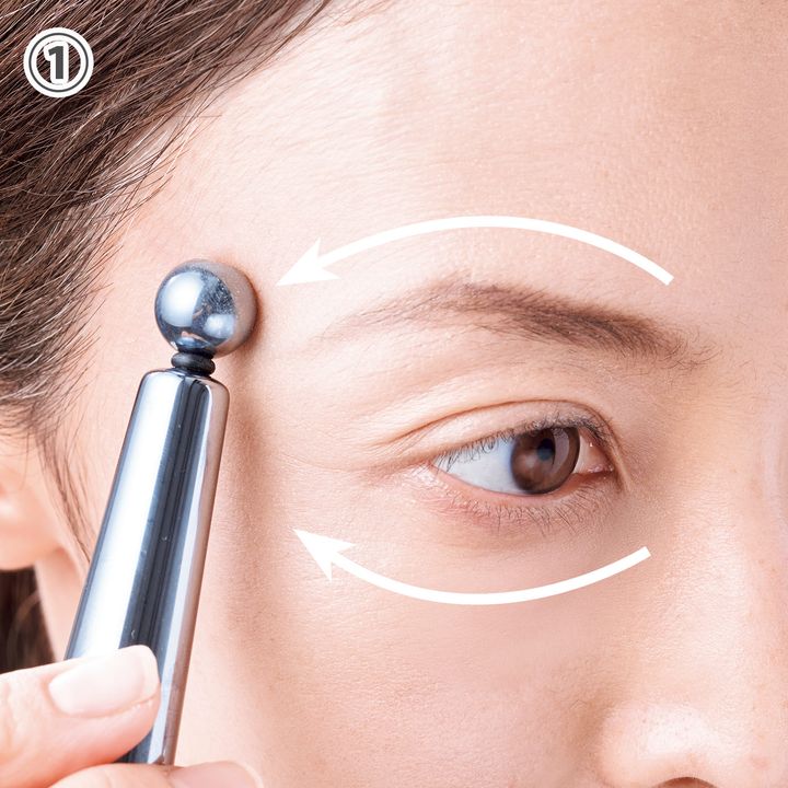 眉上、目袋を内側からこめかみに向かって5往復。目元のこわばりを緩め、すっきりと。