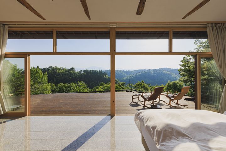 ツリーハウス室内では、畳の香りと窓から差し込む木漏れ日に心が和む。ツリーハウスの隣には、建築家の村井正が開発した木造コテージ「エアロハウス」があり、内装デザインをザ・リッツ・カールトン東京や京都で知られる空間デザイナー、小市泰弘が手掛ける。エアロハウスとツリーハウスはセットで利用することが可能だ。