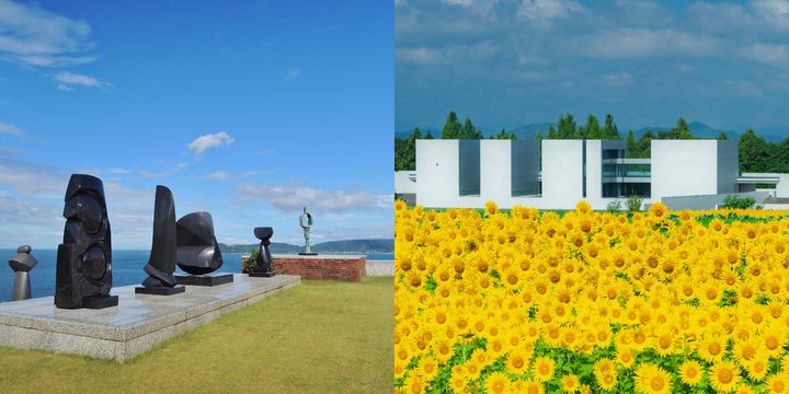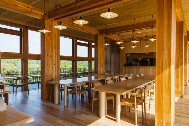 この印象的な建物を手がけたのはプリツカー賞受賞建築家の坂 茂。日本杉を組み合わせて作られた全長約100mのウッドデッキは、裸足で歩くことで木のぬくもりや香りを感じられる象徴的な空間だ。山の稜線に沿わせ、橋のように架けられたデッキの端に立つと、空中に放り出されたような感覚に包まれる。
