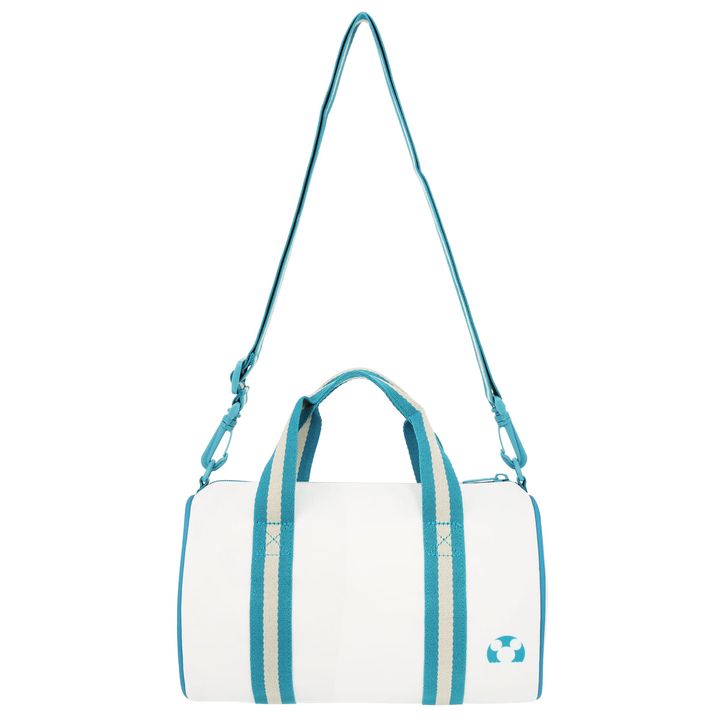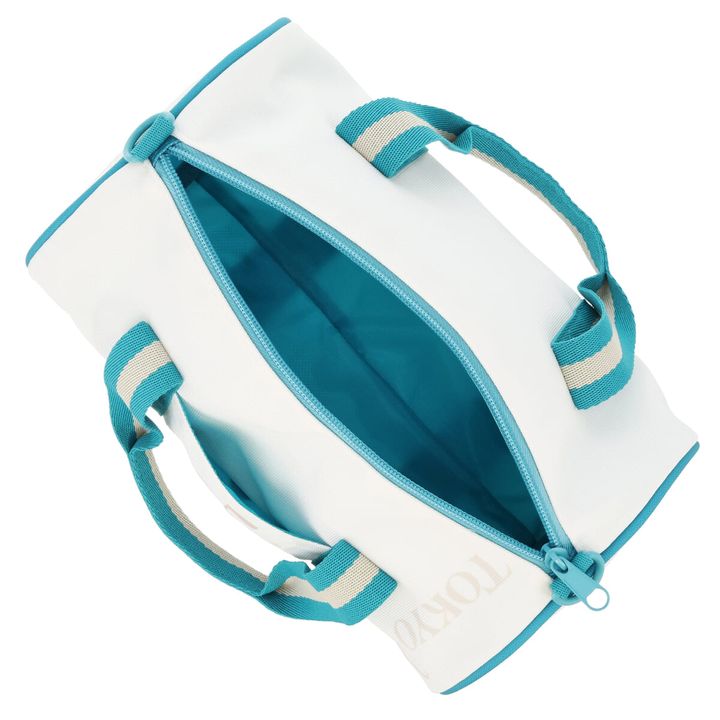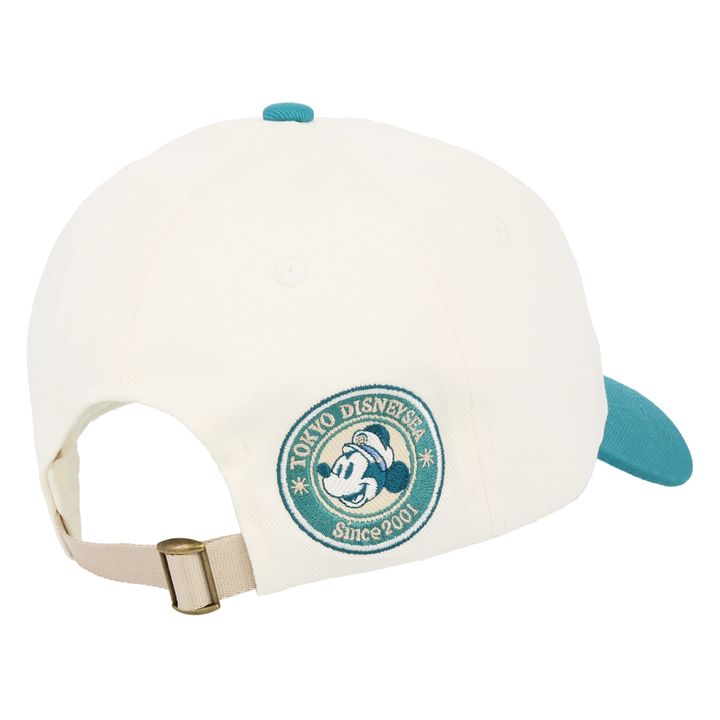 ホワイトとターコイズブルーのツートンカラーのキャップ。