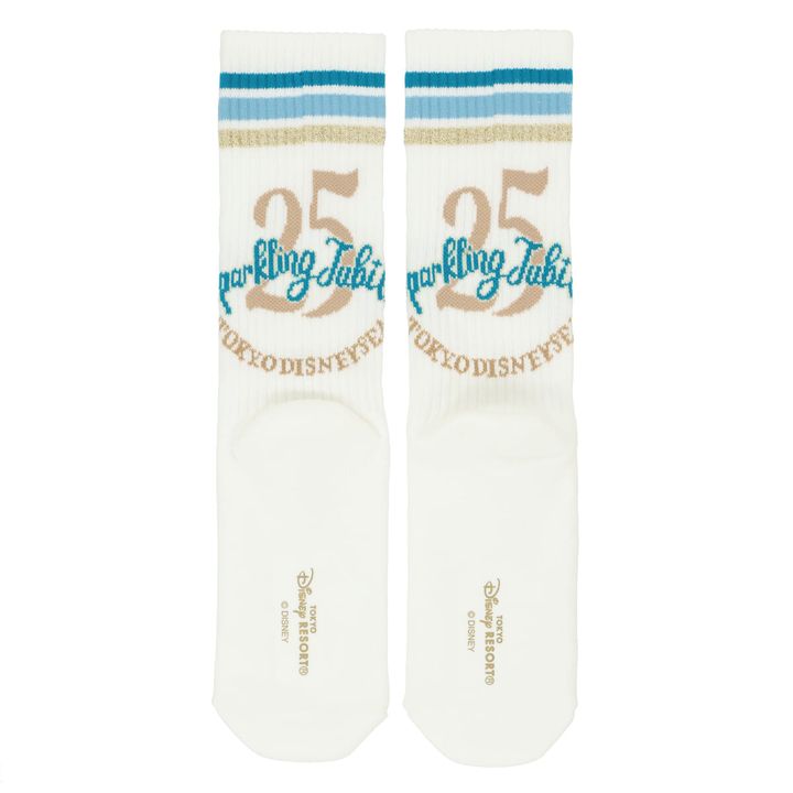 スポーティーなラインデザインと25周年のロゴが入った靴下。