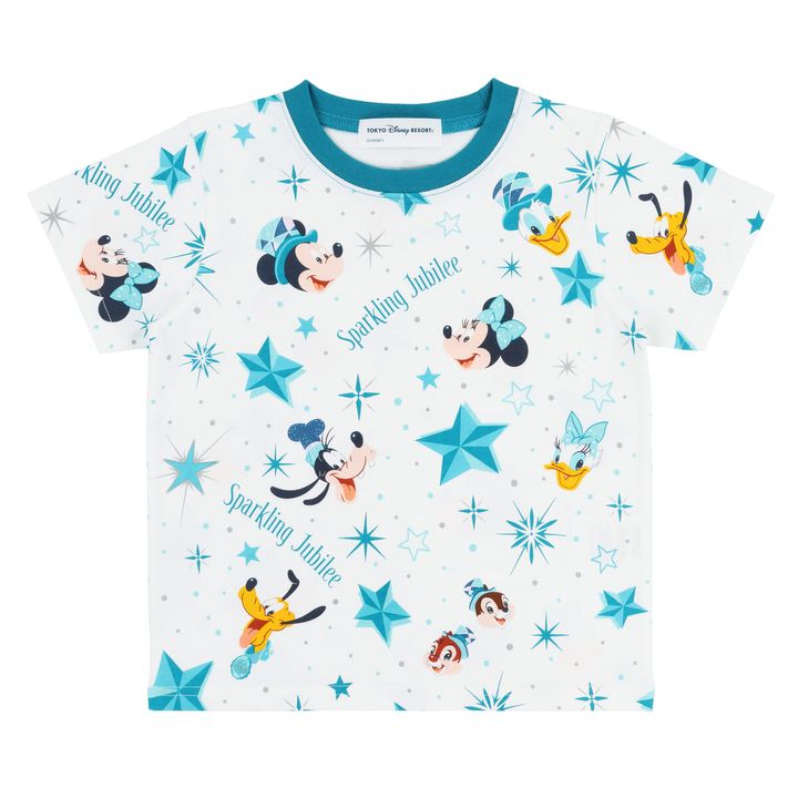 ディズニーの仲間たちや25周年のロゴが総柄でデザインされたTシャツ。