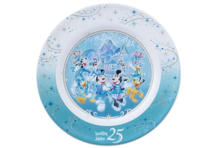 セットになるスーベニアプレートは、25周年をお祝いするミッキーマウスと仲間たちの祝祭感あふれる様子が描かれた華やかなデザイン。