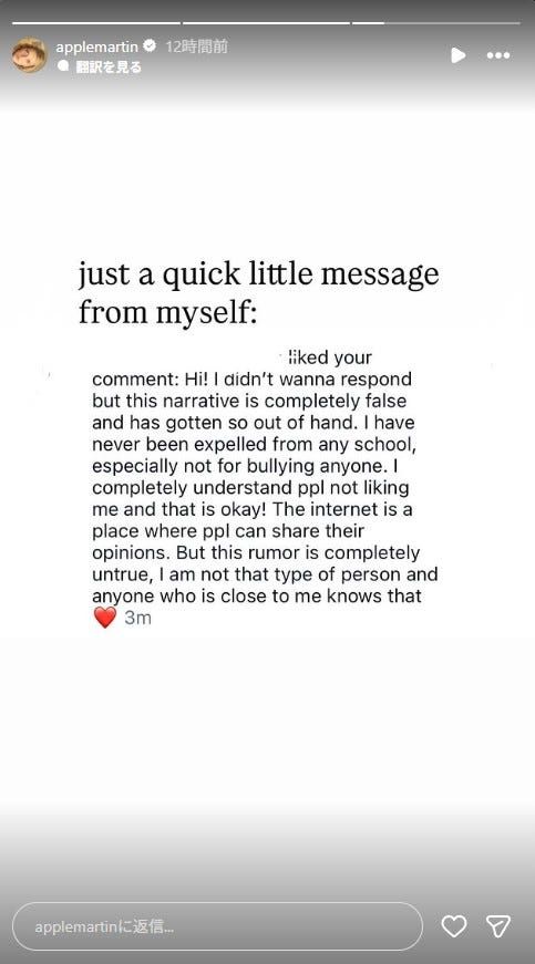 「こんにちは! 返答したくなかったのですが、この話はまったくの虚偽で、完全に行き過ぎています」「私はこれまで、いじめを理由にどの学校からも退学処分を受けたことは一度もありません」と、噂をきっぱり否定。さらに「私が嫌われることがあるのは理解していますし、それは問題ではありません。インターネットは誰もが意見を共有できる場所です。しかし、この噂は完全な虚偽。私はそんな人間ではありません。親しい人たちは皆、そのことを知っています」と続けた