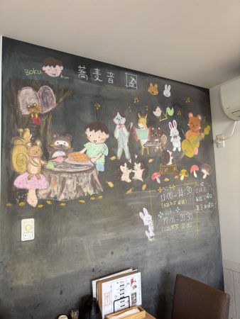 手書きのイラストが壁に書いてあってとっても可愛い店内です。