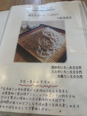 「会津坂下の契約農家から直接仕入れる玄蕎麦を自家製粉(金白挽き)し、蕎麦の実の中心約50%だけを贅沢に使用した十割手打ちそばです。」