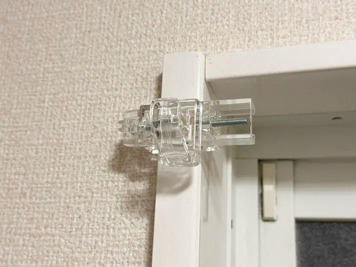 次に、『縦にも横にもはさめるかもいフック』を、ドア横にはさんで本体についているネジで締めます。