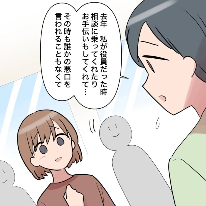 「去年、私が役員だった時、相談に乗ってくれたりお手伝いもしてくれて・・・その時も誰かの悪口を言われることもなくて」そう話すママさんの言葉に、周りにいたほかの保護者たちも次々と頷きます。その光景を見て、私は目頭が熱くなりました。