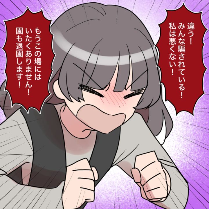田中さんは、「違う!みんな騙されている!私は悪くない!もうこの場にはいたくありません!園も退園します!」と声を張り上げました。この期に及んでもなお、自分の非を認めず他人のせいにする田中さん。私たちは、声を荒らげる彼女を無表情で見つめました。