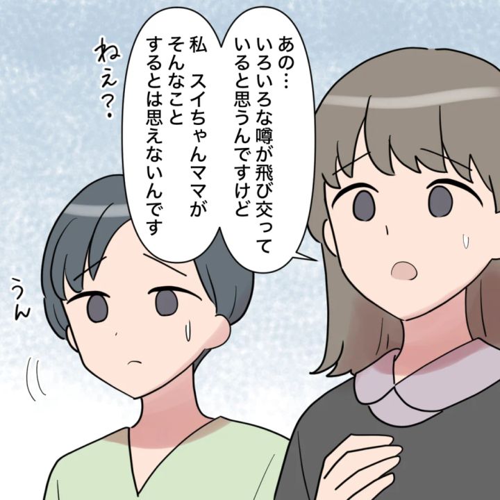 すると、ひとりのママさんが「あの・・・いろいろな噂が飛び交っていると思うんですけど、私はスイちゃんママがそんなことするとは思えないんです」と口を開きました。その言葉に、隣にいた別のママさんも同意するように頷きます。