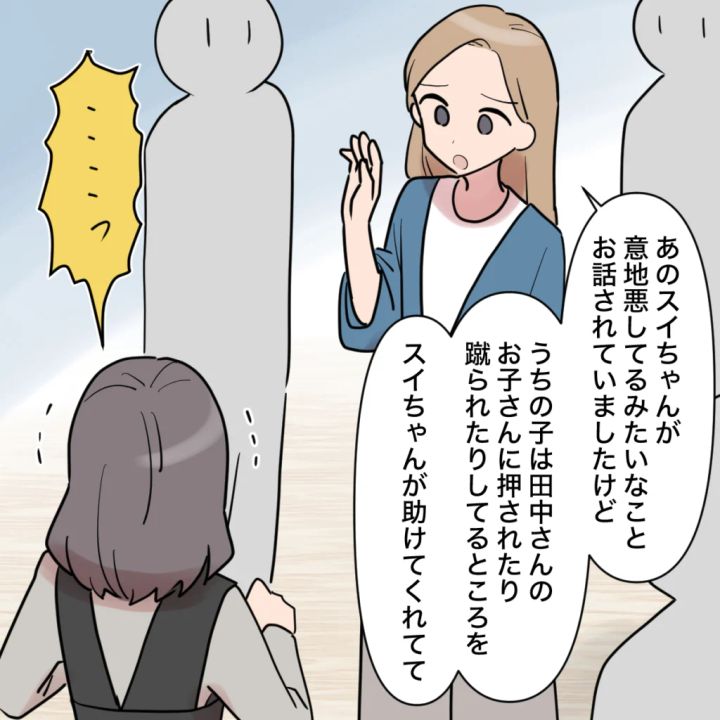 すると、また別のママさんが手を上げ、「スイちゃんが意地悪してるみたいなことお話されていましたけど、うちの子は田中さんのお子さんに押されたり、蹴られたりしているところをスイちゃんが助けてくれて」と、またしても私をかばってくれました。田中さんは、自分に味方がいないと悟ったのか、その場でわなわなと震え始めました。