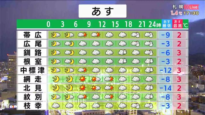 ※17日午後5時時点の情報です。最新の気象情報は、HBCウェザーセンターのホームページなどでご確認ください。HBCは気象庁の認可を2001年に得て以来、民間気象会社の一つとして「HBCの独自予報」を発信しています。