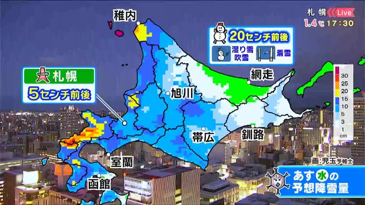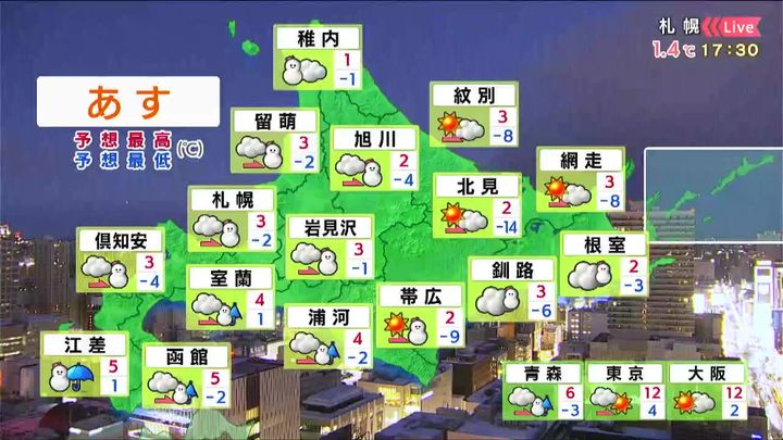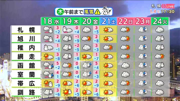 朝の雪は弱いですが、夕方以降は雪や風が強まるでしょう。宗谷地方ではあす18日(水)夜から吹雪や吹きだまりによる交通障害、落雷や突風にも注意が必要です。