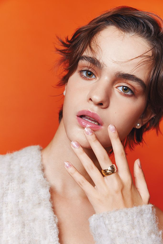 透明感のあるきらめき。さりげない色づきながら口元に存在感を宿せるスパークリングなピンクグロスも注目必至。たとえば、リッチな素材に惹かれるニットの風合いを生かすなら、リップは血色を高める程度のグロスで十分。輪郭をオーバーにとり、抜け感とかわいげを上乗せするとベター。