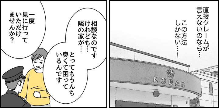 <お隣からウンチ臭>ムリムリ!ガマンの限界⇒匿名で相談。事態は改善される…はず?【まんが】