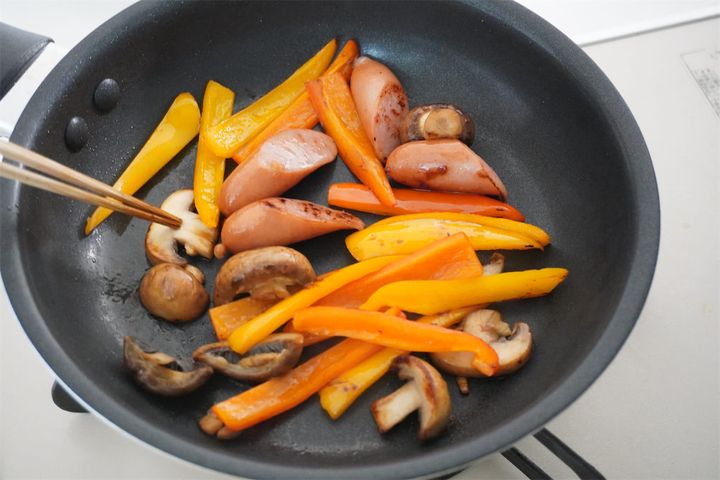 ウインナー、パプリカ、マッシュルームは食べやすい大きさに切ります。