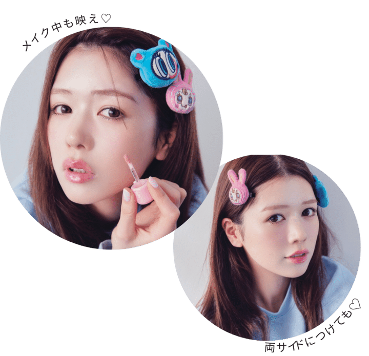 【ぬいぐるみ 前髪クリップ】もふもふ素材で映え確実のクリップ。ナカムラくんは大きめ、ベリエちゃんは小さめとサイズを変えているので、並べてつけてもアクセントになって可愛い。