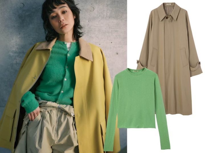鮮やかなイエローとグリーンのカラーブロックが今季らしいコートスタイル。ジャンプスーツは腰でキュッと結んでパンツライクに着て、こなれたムードを演出。ブルゾン¥110,000、カーディガン¥63,800、Tシャツ¥19,800、ジャンプスーツ¥85,800(全てオーラリー)