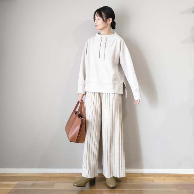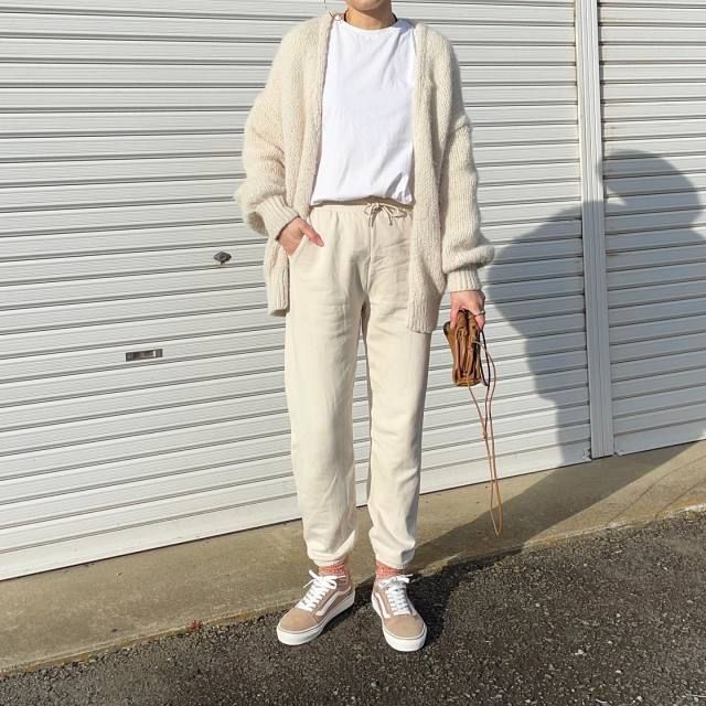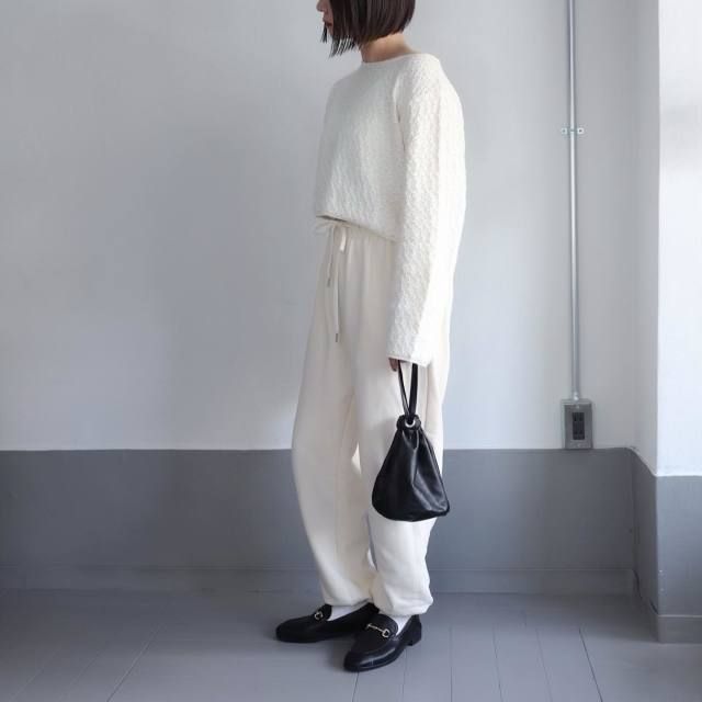 過ごしやすい秋だからこそ取り入れたいのが「ニット×スウェットパンツの白コーデ」。軽快なスウェットパンツが白独特のほっこり見えをなくし、スポーティなコーデに仕上がります。さらにニットを合わせることでスウェットパンツが街着仕様になり、リラクシーに着こなせますよ。
