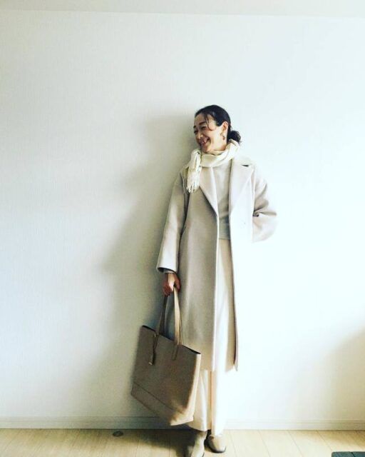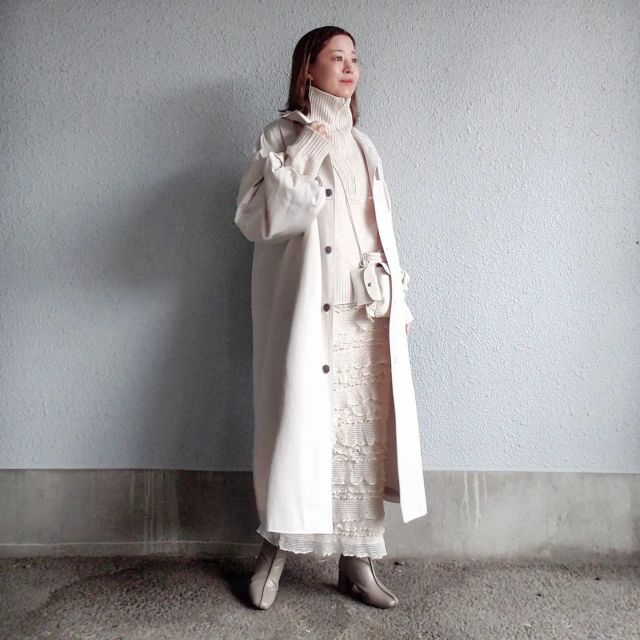 冬の全身白コーデでは白の色味を厳選するのがオシャレのコツ。真っ白ではなく、やや黄味がかったアイボリーやクリーム色を帯びたオフホワイト、きなりなどの「ミルキーなホワイト」でまとめるコーデがおすすめです。淡くて優しいミルキー配色には温かみがあり、凍てつくような寒い日のお出かけをやさしく後押ししてくれます。また重たくなりがちな冬コーデに鮮度が加わりますよ。