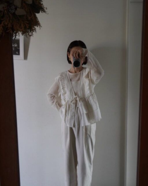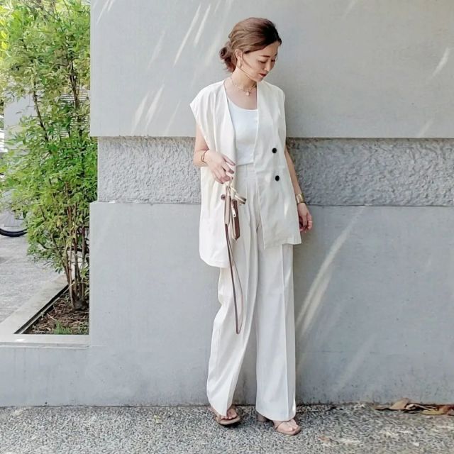 暖かい日にぴったりなのが「シアートップス×パンツの白コーデ」。爽やかな白色でまとめることでクリーンに決まるうえ、シンプルなパンツが普段使い感をプラス。これなら透け感のあるニットやブラウスも気軽に着こなせますよ。
