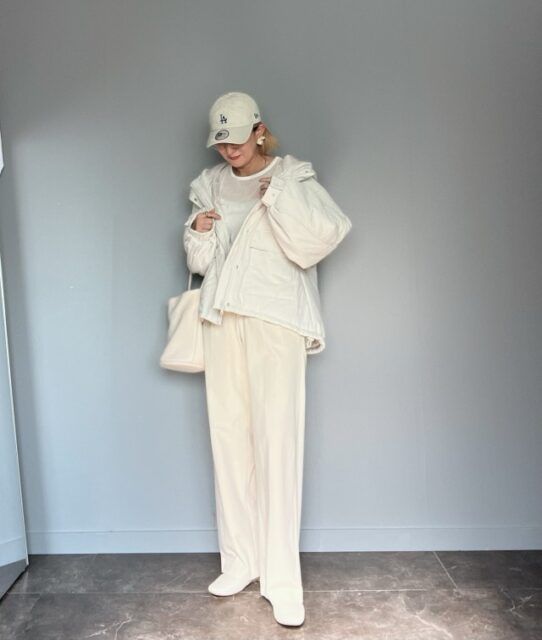 うららかな日差しが差し込む春は全身白コーデに最適な季節。その一方で気温の変化も激しいので、白アウターでコーデを仕上げましょう。