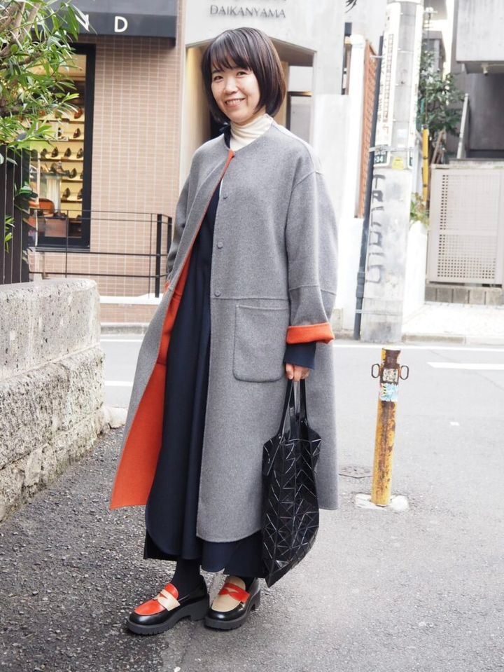 普段はベーシックなカラーを選ぶことが多いというYUMIさんですが、休日はカラーアイテムを取り入れてテンションアップ。グレーとオレンジのリバーシブルコートとローファーの色合わせが◎。締め色のネイビーのワンピースとの相性も抜群です。