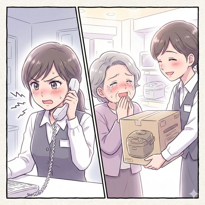 私は家電量販店で働く店員です。ある日、SNSで話題になり、どこの店舗でも品薄状態が続いている最新の高級炊飯器について、一人の男性客から電話がありました。