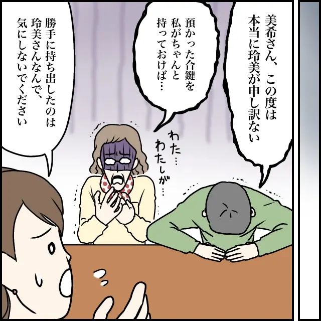 「美希さん、この度は本当に玲美が申し訳ない」「預かった合鍵を私がちゃんと持っておけば・・・」そう言って体を震わせ、顔を真っ青にして謝る義両親。私は「勝手に持ち出したのは玲美さんなので、気にしないでください」と伝えました。どうやら玲美さんは、義母が預かっていた合鍵を無断で持ち出し、それを使って私たちの自宅に侵入したようです。
